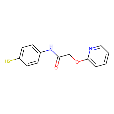 O=C(COc1ccccn1)Nc1ccc(S)cc1| HBA: | 4 | RingCount: | 2 |