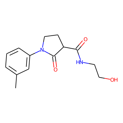 Cc1cccc(N2CCC(C(=O)NCCO)C2=O)c1| HBA: | 5 | RingCount: | 2 |