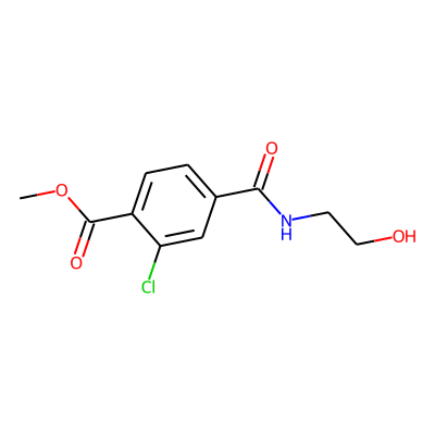 COC(=O)c1ccc(C(=O)NCCO)cc1Cl| HBA: | 5 | RingCount: | 1 |