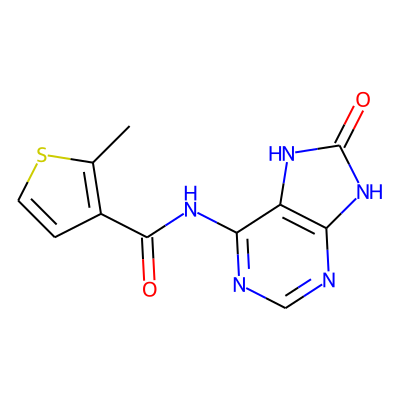 Cc1sccc1C(=O)Nc1ncnc2[nH]c(=O)[nH]c12| HBA: | 7 | RingCount: | 3 |