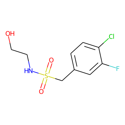 O=S(=O)(Cc1ccc(Cl)c(F)c1)NCCO| HBA: | 4 | RingCount: | 1 |