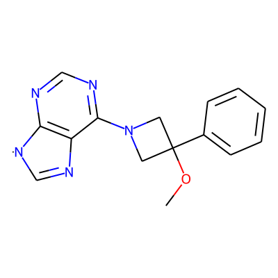 COC1(c2ccccc2)CN(c2ncnc3c2N=C[N]3)C1| HBA: | 6 | RingCount: | 4 |
