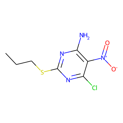 CCCSc1nc(N)c([N+](=O)[O-])c(Cl)n1| HBA: | 6 | RingCount: | 1 |