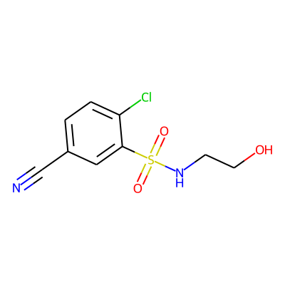 N#Cc1ccc(Cl)c(S(=O)(=O)NCCO)c1| HBA: | 5 | RingCount: | 1 |