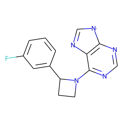 Fc1cccc(C2CCN2c2ncnc3c2N=C[N]3)c1| HBA: | 5 | RingCount: | 4 |