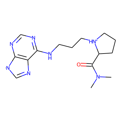 CN(C)C(=O)C1CCC[NH+]1CCCNc1ncnc2c1N=C[N]2| HBA: | 8 | RingCount: | 3 |