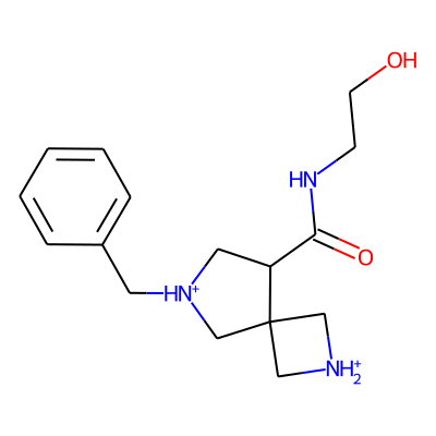 O=C(NCCO)C1C[NH+](Cc2ccccc2)CC12C[NH2+]C2| HBA: | 5 | RingCount: | 3 |