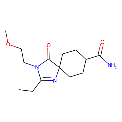 CCC1=NC2(CCC(C(N)=O)CC2)C(=O)N1CCOC| HBA: | 6 | RingCount: | 2 |