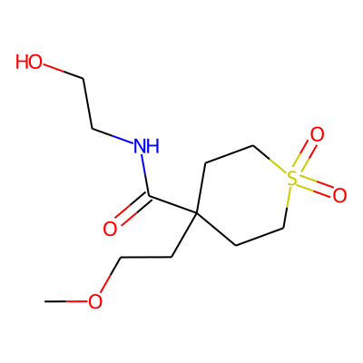 COCCC1(C(=O)NCCO)CCS(=O)(=O)CC1| HBA: | 6 | RingCount: | 1 |
