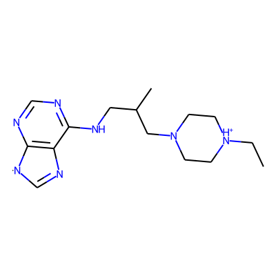 CC[NH+]1CCN(CC(C)CNc2ncnc3c2N=C[N]3)CC1| HBA: | 7 | RingCount: | 3 |