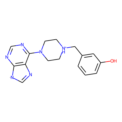 Oc1cccc(C[NH+]2CCN(c3ncnc4c3N=C[N]4)CC2)c1| HBA: | 7 | RingCount: | 4 |