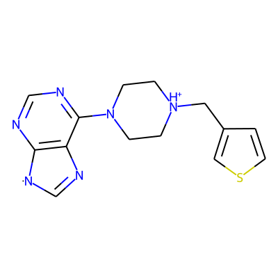 C1=Nc2c(ncnc2N2CC[NH+](Cc3ccsc3)CC2)[N]1| HBA: | 6 | RingCount: | 4 |
