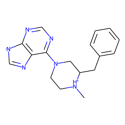 C[NH+]1CCN(c2ncnc3c2N=C[N]3)CC1Cc1ccccc1| HBA: | 6 | RingCount: | 4 |