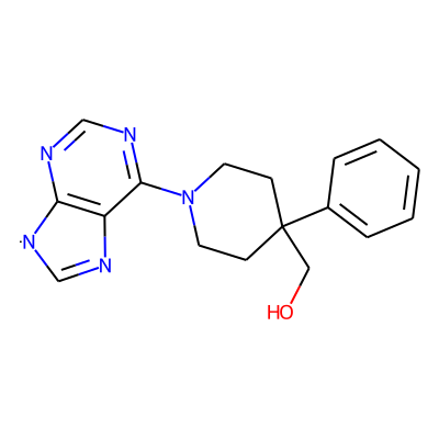 OCC1(c2ccccc2)CCN(c2ncnc3c2N=C[N]3)CC1| HBA: | 6 | RingCount: | 4 |