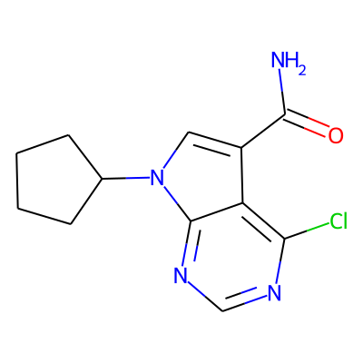 NC(=O)c1cn(C2CCCC2)c2ncnc(Cl)c12| HBA: | 5 | RingCount: | 3 |