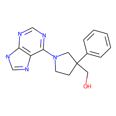OCC1(c2ccccc2)CCN(c2ncnc3c2N=C[N]3)C1| HBA: | 6 | RingCount: | 4 |