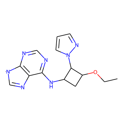 CCOC1CC(Nc2ncnc3c2N=C[N]3)C1n1cccn1| HBA: | 8 | RingCount: | 4 |