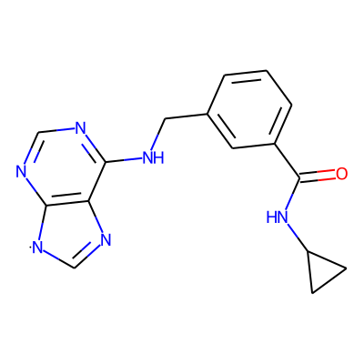 O=C(NC1CC1)c1cccc(CNc2ncnc3c2N=C[N]3)c1| HBA: | 7 | RingCount: | 4 |