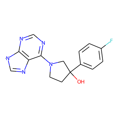 OC1(c2ccc(F)cc2)CCN(c2ncnc3c2N=C[N]3)C1| HBA: | 6 | RingCount: | 4 |