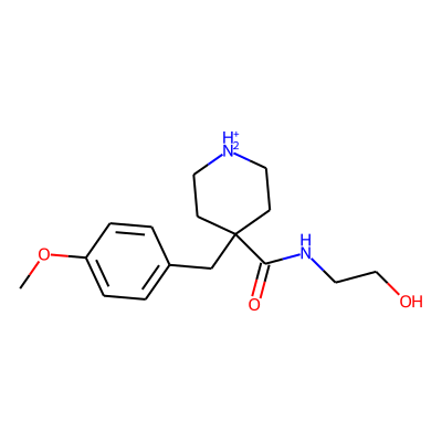 COc1ccc(CC2(C(=O)NCCO)CC[NH2+]CC2)cc1| HBA: | 5 | RingCount: | 2 |