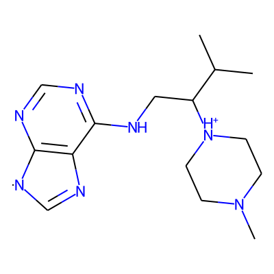 CC(C)C(CNc1ncnc2c1N=C[N]2)[NH+]1CCN(C)CC1| HBA: | 7 | RingCount: | 3 |