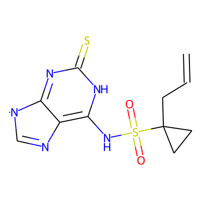 C=CCC1(S(=O)(=O)Nc2[nH]c(=S)nc3c2N=C[N]3)CC1| HBA: | 7 | RingCount: | 3 |