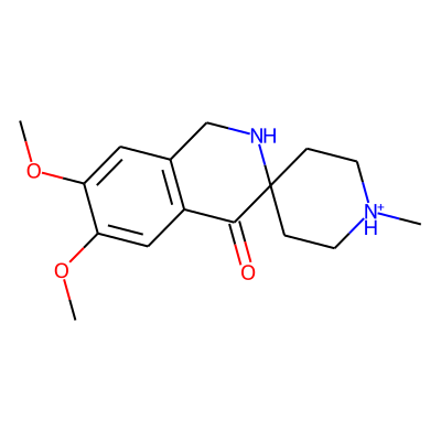 COc1cc2c(cc1OC)C(=O)C1(CC[NH+](C)CC1)NC2| HBA: | 5 | RingCount: | 3 |