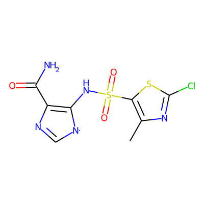 Cc1nc(Cl)sc1S(=O)(=O)NC1=C(C(N)=O)N=C[N]1| HBA: | 8 | RingCount: | 2 |