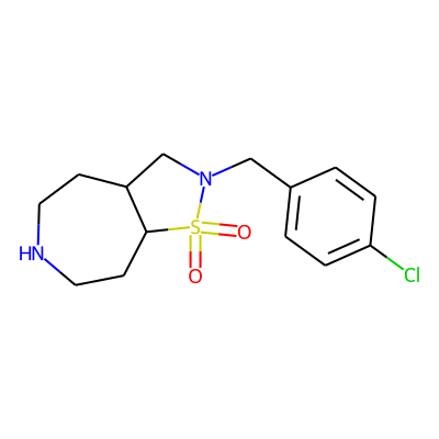 O=S1(=O)C2CCNCCC2CN1Cc1ccc(Cl)cc1| HBA: | 4 | RingCount: | 3 |