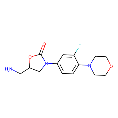 NCC1CN(c2ccc(N3CCOCC3)c(F)c2)C(=O)O1| HBA: | 6 | RingCount: | 3 |