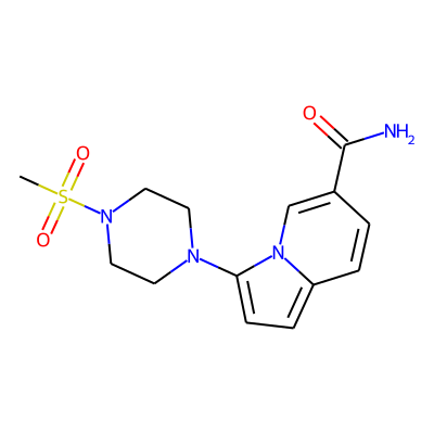 CS(=O)(=O)N1CCN(c2ccc3ccc(C(N)=O)cn23)CC1| HBA: | 7 | RingCount: | 3 |