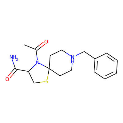 CC(=O)N1C(C(N)=O)CSC12CC[NH+](Cc1ccccc1)CC2| HBA: | 5 | RingCount: | 3 |