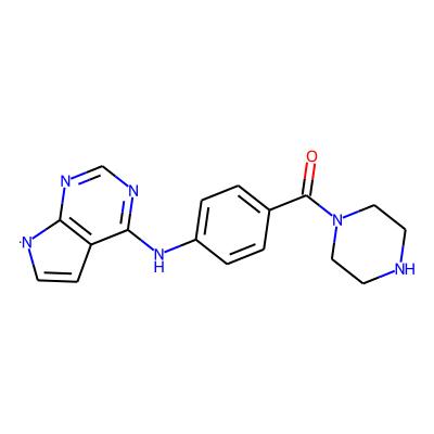 O=C(c1ccc(Nc2ncnc3c2C=C[N]3)cc1)N1CCNCC1| HBA: | 7 | RingCount: | 4 |