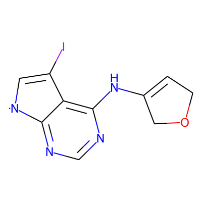 IC1=C[N]c2ncnc(NC3=CCOC3)c21| HBA: | 5 | RingCount: | 3 |