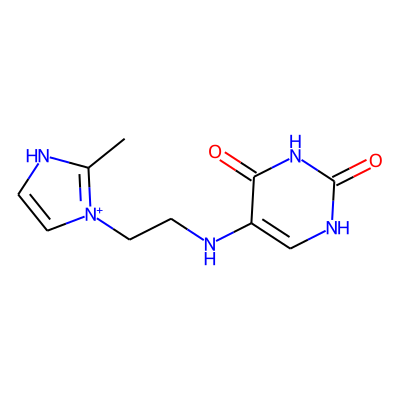 Cc1[nH]cc[n+]1CCNc1c[nH]c(=O)[nH]c1=O| HBA: | 7 | RingCount: | 2 |