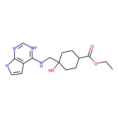 CCOC(=O)C1CCC(O)(CNc2[nH+]cnc3c2C=C[N]3)CC1| HBA: | 7 | RingCount: | 3 |
