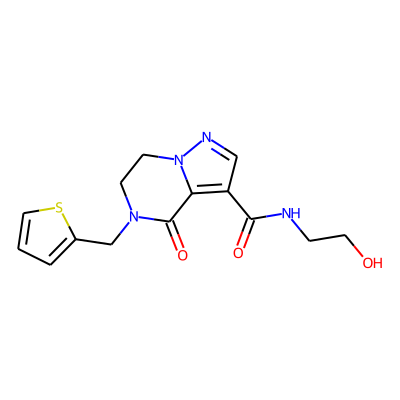 O=C(NCCO)c1cnn2c1C(=O)N(Cc1cccs1)CC2| HBA: | 7 | RingCount: | 3 |