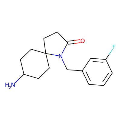 NC1CCC2(CCC(=O)N2Cc2cccc(F)c2)CC1| HBA: | 3 | RingCount: | 3 |