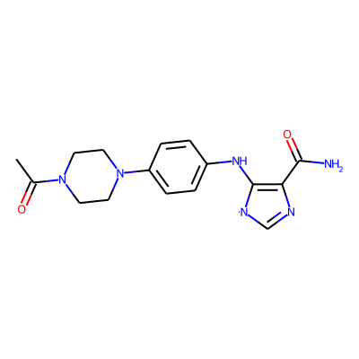CC(=O)N1CCN(c2ccc(NC3=C(C(N)=O)N=C[N]3)cc2)CC1| HBA: | 8 | RingCount: | 3 |