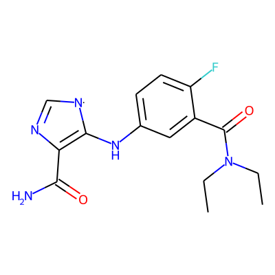 CCN(CC)C(=O)c1cc(NC2=C(C(N)=O)N=C[N]2)ccc1F| HBA: | 7 | RingCount: | 2 |