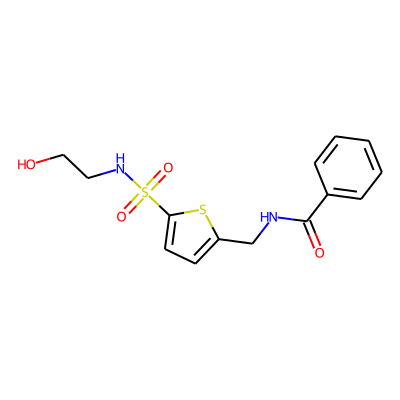 O=C(NCc1ccc(S(=O)(=O)NCCO)s1)c1ccccc1| HBA: | 6 | RingCount: | 2 |