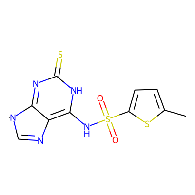 Cc1ccc(S(=O)(=O)Nc2[nH]c(=S)nc3c2N=C[N]3)s1| HBA: | 7 | RingCount: | 3 |