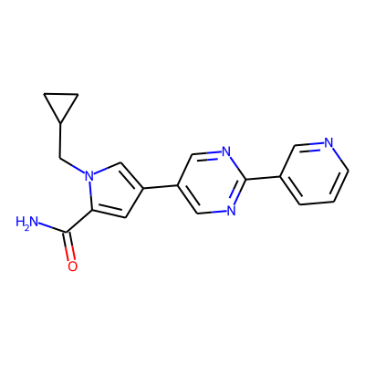 NC(=O)c1cc(-c2cnc(-c3cccnc3)nc2)cn1CC1CC1| HBA: | 6 | RingCount: | 4 |