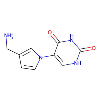 [NH3+]Cc1ccn(-c2c[nH]c(=O)[nH]c2=O)c1| HBA: | 6 | RingCount: | 2 |
