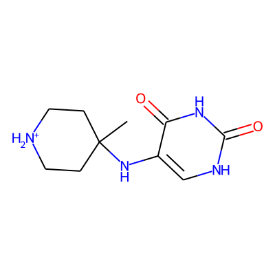 CC1(Nc2c[nH]c(=O)[nH]c2=O)CC[NH2+]CC1| HBA: | 6 | RingCount: | 2 |