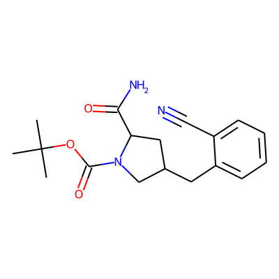CC(C)(C)OC(=O)N1CC(Cc2ccccc2C#N)CC1C(N)=O| HBA: | 6 | RingCount: | 2 |