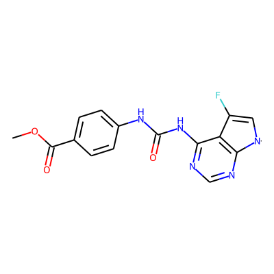 COC(=O)c1ccc(NC(=O)Nc2ncnc3c2C(F)=C[N]3)cc1| HBA: | 8 | RingCount: | 3 |
