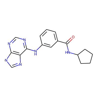 O=C(NC1CCCC1)c1cccc(Nc2ncnc3c2N=C[N]3)c1| HBA: | 7 | RingCount: | 4 |