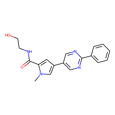 Cn1cc(-c2cnc(-c3ccccc3)nc2)cc1C(=O)NCCO| HBA: | 6 | RingCount: | 3 |