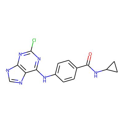 O=C(NC1CC1)c1ccc(Nc2nc(Cl)nc3c2N=C[N]3)cc1| HBA: | 7 | RingCount: | 4 |